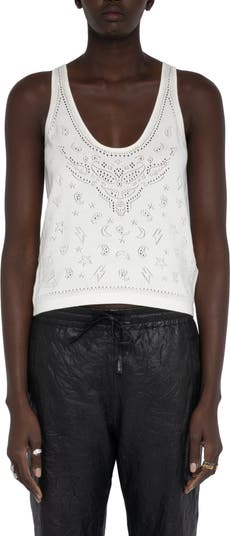 Sweet meets subversive in this soft cotton tank, where hearts, stars and bandana-inspired paisley motifs play against Zadig & Voltaire’s signature wings, lightning bolts and skulls—all in intricate pointelle stitching.