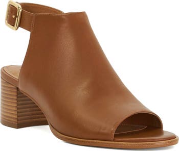 A cutout at the heel counter and wide vamp strap create modern dimension on a supple leather sandal lofted by a stacked heel and secured with an adjustable buckle closure.