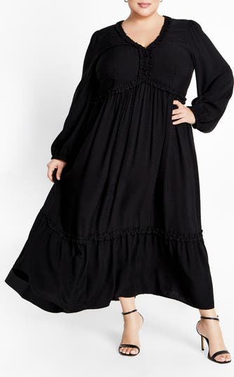 This long‑sleeve maxi dress brings understated drama with ruffled details and a flowy tiered skirt.