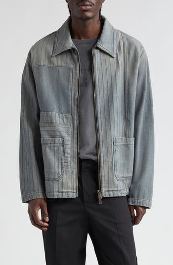 Italian denim brings signature lived-in charm to this stripey patchwork jacket outfitted with handy front pockets.
