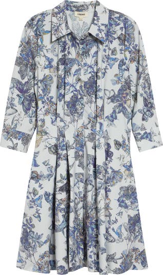 Sharp skirt pleats enhance the flared silhouette of this shirtdress cut from a crisp cotton blend and romanced by delightful blooms.