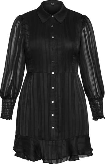 Sheer smocked-cuff sleeves frame this polished shirtdress updated with satiny stripes for a sophistication and shine.