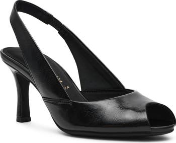 An elasticized slingback strap and clean peep toe define this modern pump balanced on a slender heel for timeless polish.