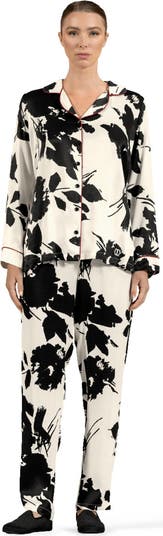 - The spectacular floral print is complemented by bright red edging on the collar and cuffs of the pajamas.