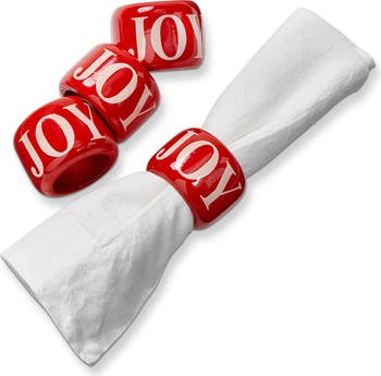 - Elevate your Christmas table decor with the Joy Red Wood Napkin Ring Set crafted from durable wood featuring a vibrant red finish perfect for adding a festive touch to your holiday dining experience measuring 1.5 inches in height and 2 inches in diameter these artisan-made napkin rings are designed for easy maintenance and can be wiped clean ensuring they remain beautiful for every gathering this set of four adds personality and unique style to any place setting making your holiday meals even more special.