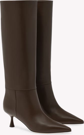 Crafted from leather, Joyce is a pointed-toe pull-on knee boot with a tonal lacquered 55mm flare kitten heel. Handmade in Italy.