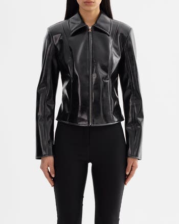 The Joyce Faux Leather Jacket combines a sharp tailored shape with a modern edge. Designed with a pointed shirt collar, curved hem, and center front zip closure, it strikes the balance between structure and versatility. Fully lined and finished with discreet details, it is a refined layer that transitions effortlessly from day to night.