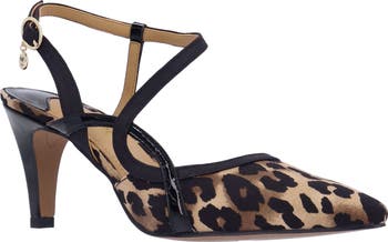 An asymmetric vamp strap and pointy toe create modern dimension on an animal-patterned pump set on a well-cushioned footbed and tapered heel.