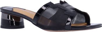Mixed textures and a notched vamp strap lend visual intrigue to a slide sandal balanced by a squared-off toe and cylindrical block heel.