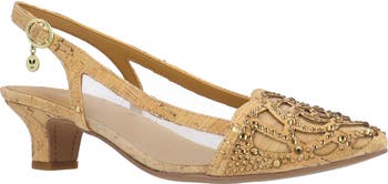Intricate embellishments and sheer mesh cutouts adorn the cork upper of this pointed-toe slingback pump delivering artisan-crafted detail on a low, comfortable heel.
