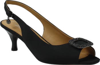 A shiny brooch dazzles the top of a classic slingback sandal set on a walkable tapered heel.