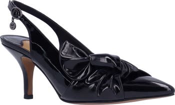 A glossy finish highlights a pointy-toe pump topped with a slim ankle strap and built with memory foam cushioning for extra support.