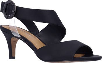 A jewel-encrusted buckle adds visual intrigue to the ankle of a satiny sandal grounded by a cushioned footbed and tapered heel.