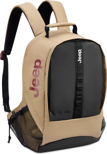 Introducing the rugged Jeep JS011B Versatile Backpack, crafted from recycled water-resistant polyester for eco-conscious adventurers. With two compartments secured by hidden zippers, daisy chain webbing for additional gear, and padded straps for comfort, it's perfect for travel, school, or work. Stay organized with a laptop sleeve, water bottle pockets, and a convenient luggage band. Embrace versatility and sustainability with Jeep on your back for all your journeys.