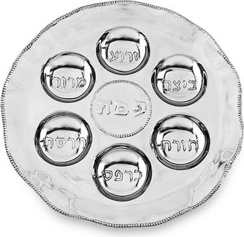 The Beatriz Ball Judaica silver Seder plate brings rich detail and timeless design to your table. Rimmed with sparkling metal pearls, this Seder Plate is a worthy center of attention, and is sure to become a cherished family heirloom, as well as a great wedding gift..