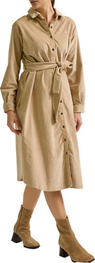 Corduroy maternity dress with stretch comfort, full button-down front for discreet nursing access, and timeless design to wear beyond pregnancy.