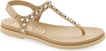 This sandal is as comfortable as it is cute. The strap hits well below the ankle bone and the toe thingy is soft. The footbed gives support without looking orthopedic. My foot is slightly wide and the width on this sandal is still good for me, my toes stay on firmly. I'll be getting my money's worth out of these!! A note on the crystals: though they are large, they don't seem too "blingy". They don't sparkle, they actually look more like studs. So the crystals are still very much in keeping with a clean, minimalist look. I usually wear 7.5 or 8, I took the 38 in these and they fit perfectly.