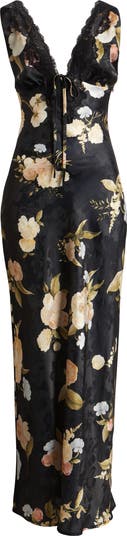 Tumbled in blooms and cut to skim your curves, this luscious, lace-lilted satin slipdress will get glasses raised in tribute.