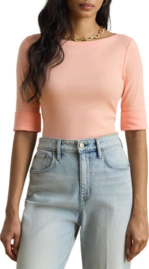 Designed with a refined boat neckline and neat elbow-length sleeves, this top feels streamlined and versatile. The stretch-cotton knit stays comfortable and smooth, holding its shape while keeping the look sharp.