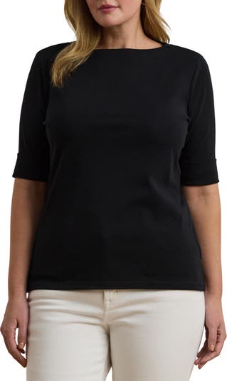 Designed with a refined boat neckline and neat elbow-length sleeves, this top feels streamlined and versatile. The stretch-cotton knit stays comfortable and smooth, holding its shape while keeping the look sharp.