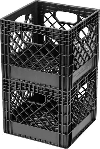 STACKABLE MILK CRATE: 2 PACK - 16 QUART- BLACK – Discover the versatility of this authentic dairy crate, a robust storage solution designed for both practical and decorative purposes. MULT-PURPOSE: This 16 quart plastic milk crate is great for storing toys, sporting equipment, clothing, holiday accessories, housewares, books, and other odds and ends. A must-have when organizing your home and garage. HEAVY-DUTY HDPE CONSTRUCTION: The integrated handles make for comfortable carrying, and the sturdy bottom grid provides stable support for heavy items. It features a smooth interior surface and a distinctive cross-hatched pattern that provides excellent ventilation while maintaining structural integrity. The rigid structure ensures items stay secure, while the open-grid design allows for easy visibility of contents. STACKING DESIGN: Multiple crates can easily stack on top of each other for an efficient use of vertical space. USE ANYWHERE: Utilize anywhere you need storage solutions – vehicle, home, office, nursery, classroom, garage! INDOOR & OUTDOOR: Suitable for both indoor and outdoor use, these plastic milk crates for storage resist the elements and maintain their structural integrity over time. Upgrade your storage game with the Juggernaut Storage 16 Quart Square Stackable Crates - a stylish and practical solution for keeping your space neat, organized, and clutter-free. OVERVIEW: 2 Pack. Durable Construction, Stackable, Grid Pattern, Ventilated Design. Inside dimensions: 12 x 12 x 10.5 inches. Exterior dimensions: 13 x 13 x 11 inches. Size: 16 Quart. Supports up to 50 lbs. Material: polyethylene plastic.