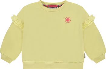 This yellow-toned crewneck sweatshirt features ruffled accents at the puff sleeves and a retro style juice box graphic on the back of the garment.