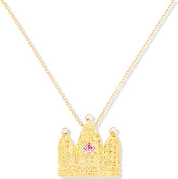A royal necklace for all the kings and queens, the Juju Crown Charm Necklace hangs from a 14k gold diamond cut cable chain and is covered in yellow sapphire, diamond, and a custom-cut pink sapphire. Part of the highly collectible Juju Collection, each charm features signature ribbing detail and the same gold design on the back.