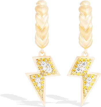 Full of whimsy, the Juju Lightning Bolt Charm Huggie features a lighting bolt charm covered in sparkling diamonds and yellow sapphires. Anchored by a textural chevron ribbed huggie, these easy-to-wear earrings feature signature ribbing on the back of the charm in gold, providing a charm fully designed from front to back.