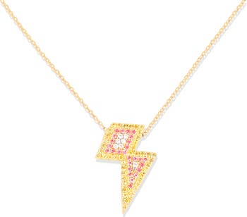 A bold symbol, representing strength, the Juju Lightning Bolt Charm Necklace sparkles with diamonds, and pink and yellow sapphires. Hanging from a 14k gold diamond cut cable chain, and part of the highly collectible Juju Collection, each charm features signature ribbing detail and the same gold design on the back.