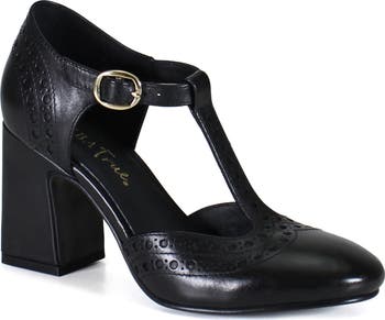 The JUKE BOX by Diba True blends vintage charm with modern sophistication. This leather T-strap Mary Jane pump features a buckle closure for a secure fit, a 3-inch chunky covered heel for stability, and a round toe for a timeless, feminine touch. Intricate broguing details add classic elegance, making this dress shoe a versatile choice.