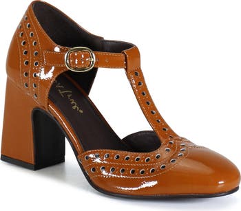The JUKE BOX by Diba True blends vintage charm with modern sophistication. This leather T-strap Mary Jane pump features a buckle closure for a secure fit, a 3-inch chunky covered heel for stability, and a round toe for a timeless, feminine touch. Intricate broguing details add classic elegance, making this dress shoe a versatile choice.