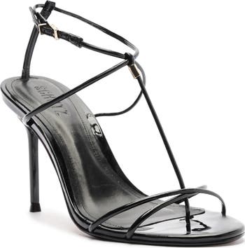 Tubular straps cascade down the vamp of a sultry leather sandal featuring glints of polished hardware and lofted by a soaring stiletto heel.