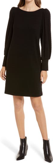 When dress days fall during sweater season, this textured frock, knit with a graceful boat neck and billowed sleeves, is how to come through in cozy style.