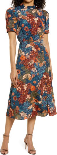Autumnal hues color the glorious garden covering this puff-sleeve dress cut in a classic A-line shape and ready for meetings and meetups alike.