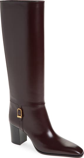 A gleaming logo-engraved buckle sits at the ankle, standing out as the only detailing on this minimalist tall boot made from smooth, polished Italian leather and shaped with an elongated square toe and sturdy block heel.