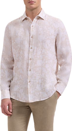 A soft shadow-floral pattern covers this shirt cut from a breathable linen fabric with a smart point collar and a curved hem that looks great whether you tuck it in or wear it casually out.