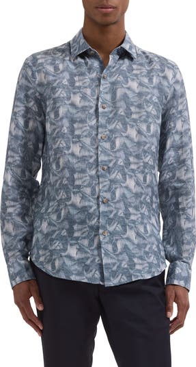 Tailored from lightweight, breathable linen, this shirt scattered in stylized leaves features a crisp collar and a lower hem that stays tucked and looks great if you leave it hanging out. Button the adjustable cuffs for everyday or use your own cuff links to add an elevated-casual finish.