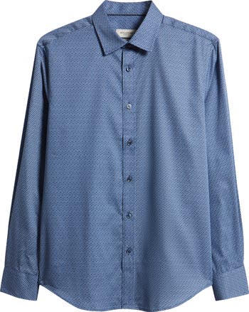 A geometric print covers a breathable cotton sport shirt cut for a modern, shaped fit that looks great tucked or untucked.
