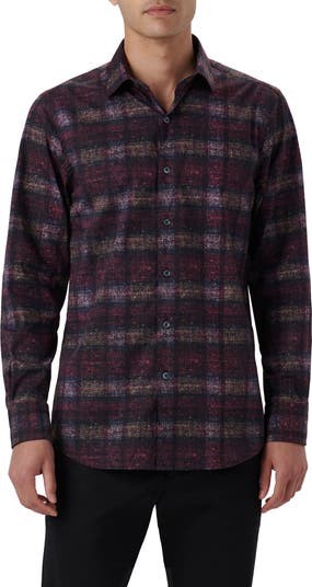 A distressed plaid print lends grungy allure to a shaped-fit sport shirt cut from stretchy, breathable cotton for easy movement.