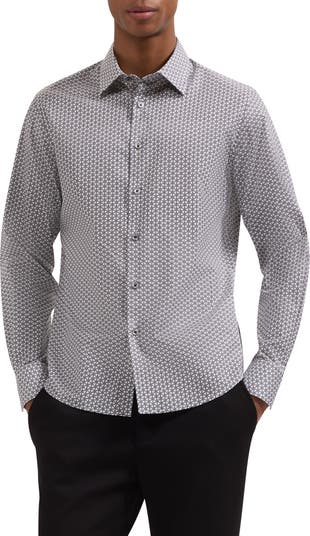 Tailored from breathable, stretch-enhanced cotton, this geo-patterned shirt features a crisp collar and a lower hem that stays tucked and looks great if you leave it hanging out. Button the adjustable cuffs for everyday or use your own cuff links to add an elevated-casual finish.