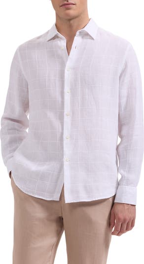 Subtle windowpane checks pattern this shirt cut from a breathable linen-blend fabric with a smart point collar and a curved hem that looks great whether you tuck it in or wear it casually out.