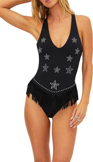 Fringe-trimmed details move with each step you take in this embellished one-piece swimsuit that serves Western flair as you lounge poolside.
