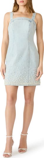 Opalescent pearly beads enhance the texture and romance of this stretch-kissed denim dress cut in a leggy length.