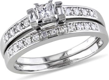 Mark your sacred commitment with the luxurious texture and brilliant variety of this diamond bridal set. Crafted in luminous sterling silver, the set features a striking combination of princess-cut, baguette, and round diamonds, creating a magnificent display of light and geometric artistry. The rings fit together perfectly, symbolizing the seamless blend of your lives. This set delivers complex sparkle and sophisticated elegance, making it an unforgettable symbol of your lasting union.