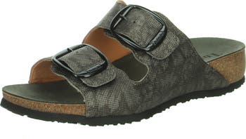 Perfectly rounded perforations dot a scalloped-edge sandal built for comfort with a contoured footbed.