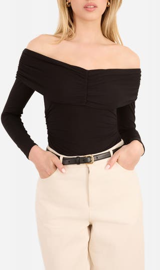 Give your curves a hug in this shoulder-baring bodysuit featuring a fold-over neck and ruched sides.