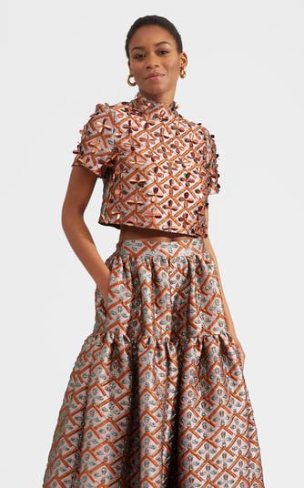Bring back the going out-out top! Crafted in our ultra-gorgeous embroidered jacquard, the Juliet Crop Top is a bonafide night owl dressing up the ordinary in your wardrobe with effortless pzazz. High collared with short sleeves and a waist-skimming crop, it’s super structured with a zip in the back. We love it with the Oscar Skirt for flirty nights in the city but feel free to pop it in your work bag to rocket your high-waisted black pants from office to out-out.