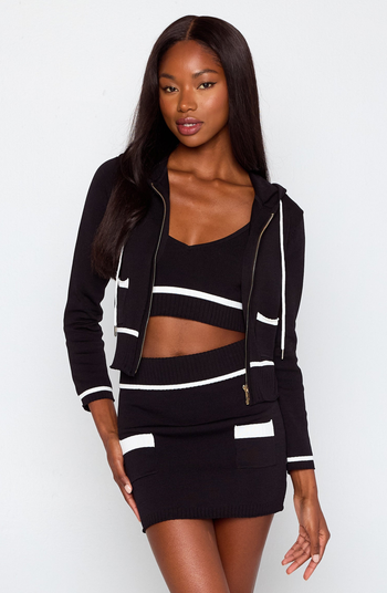 Polished yet playful, this knit mini skirt is designed with a high-rise waistband and sporty contrast stripes. Faux pocket details with trim add a chic, preppy touch. Style it with the crop tank and hoodie for a complete look.