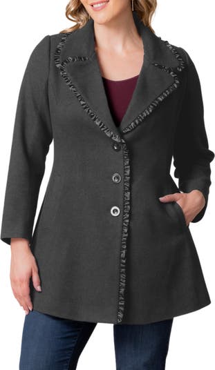 Ruffled satin trim and a soft flare from the waist to hem add playfully pretty charm to this cozy coat.