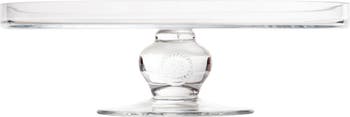 Juliska's signature Berry and Thread medallion adds old-world elegance to a sleek mouthblown glass cake pedestal perfect for displaying delicious cakes and desserts alike.